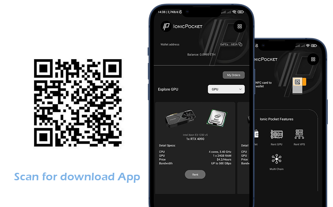Ionic Pocket enables users to easily rent services such as Virtual Private Servers (VPS), Graphic Processing Units (GPU), and blockchain nodes. Additionally, the application is equipped with NFC integration for quick and secure cryptocurrency wallet generation. With this feature, users can access necessary infrastructure and create crypto wallets seamlessly, all within one application.